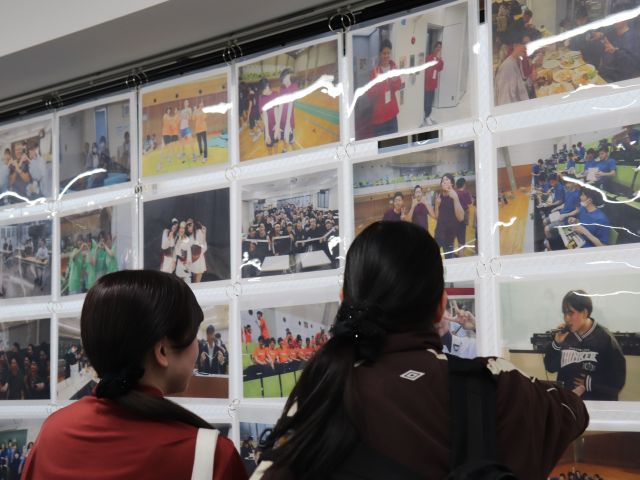 壁一面の写真を見て仲間と一緒に思い出を振り返る